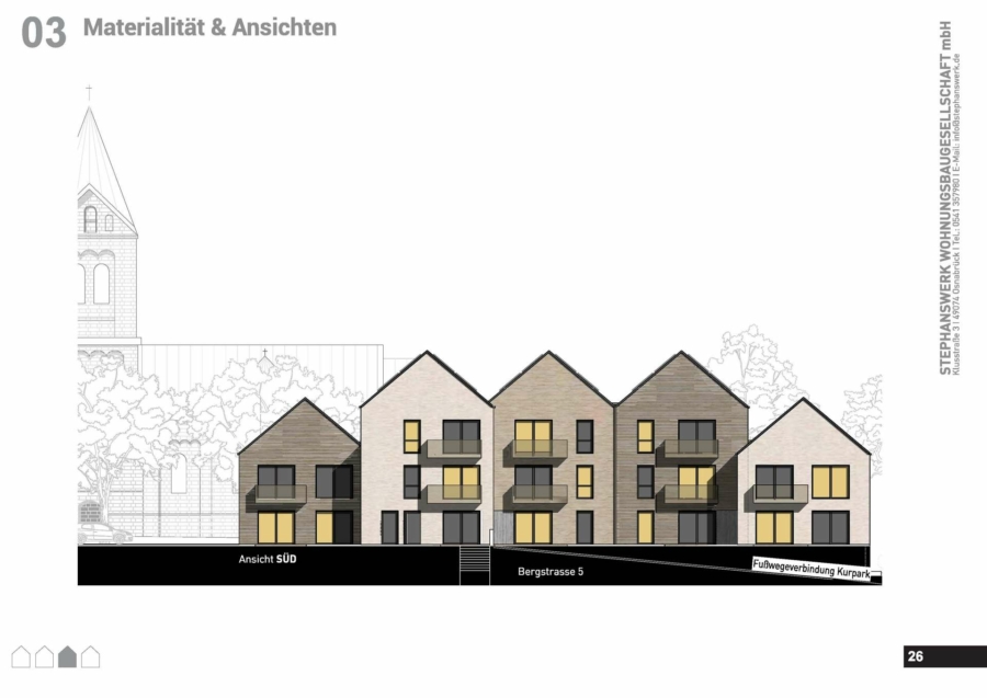 In sehr guter und zentraler Lage von Schledehausen errichtet die Stephanswerk Wohnungsbaugesellschaft mbH in unmittelbarer Nachbarschaft zum Kurgarten ein Mehrfamilienhaus mit insgesamt 19 Wohnungen sowie Gemeinderäumen für die kath. Kirchengemeinde St. Laurentius.