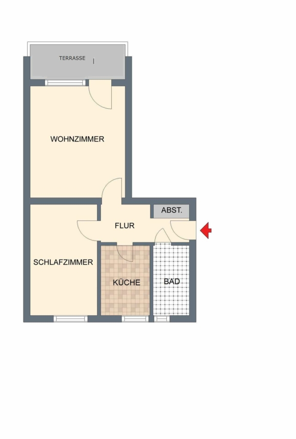 Die Wohnung besteht aus einem geräumigen Wohnzimmer mit Zugang zur Terrasse , einem Schlafzimmer, einer kleinen Küche (ohne Küchenzeile) und einer Dusche mit WC.