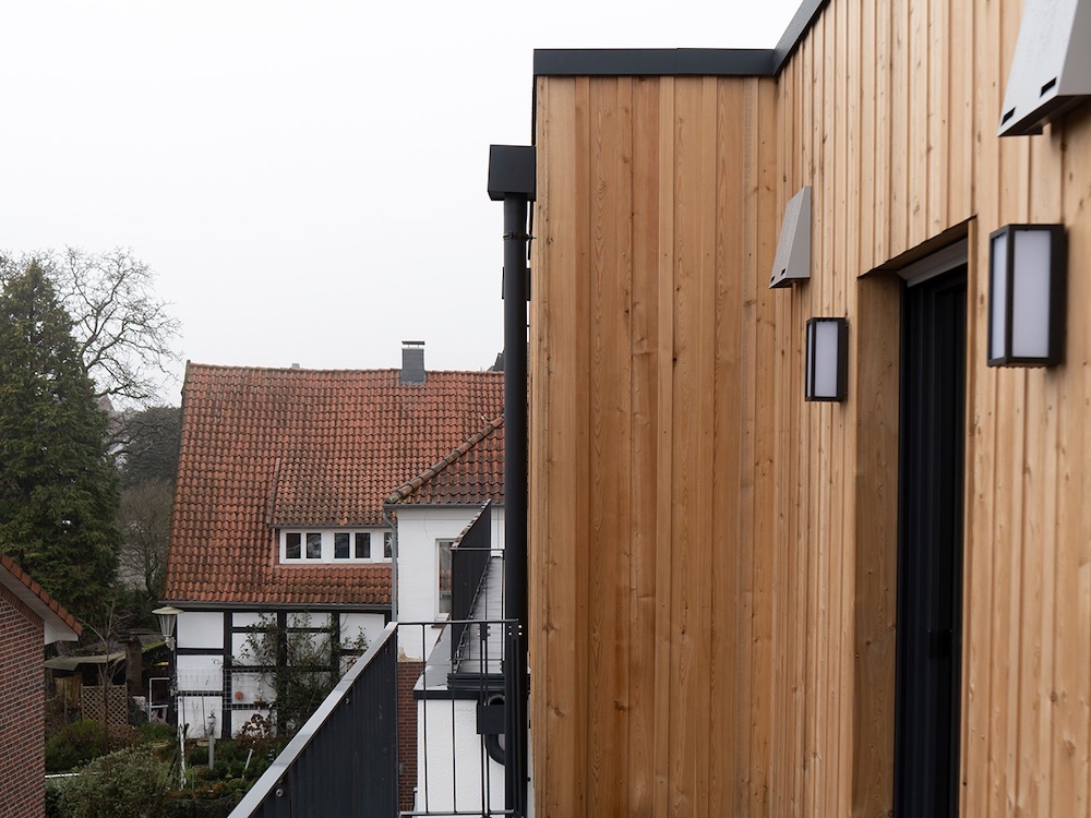 Seit kurzem kann das Mehrfamilienwohnhaus mit 12 Wohneinheiten bezogen werden. Klare Linien und Formen definieren die Fassade des Neubaus. Die Kombination aus natürlichen Materialien und Akzentuierungen in Schwarz tauchen sowohl im Außen, wie im Innenraum auf. Das Mehrfamilienwohnhaus ist in Massivbauweise realisiert worden und erfüllt den KFW Standard 40+.