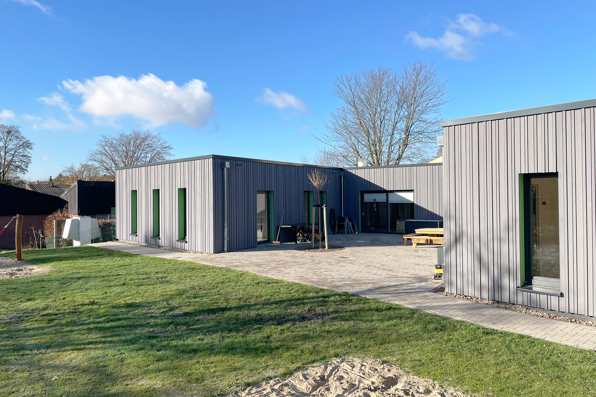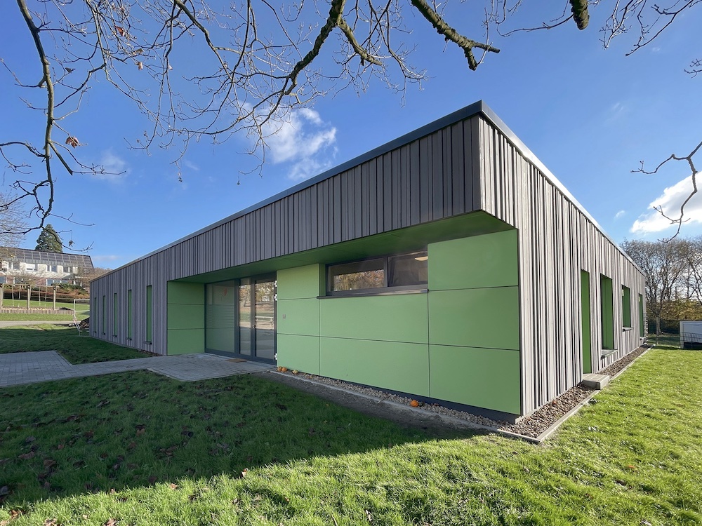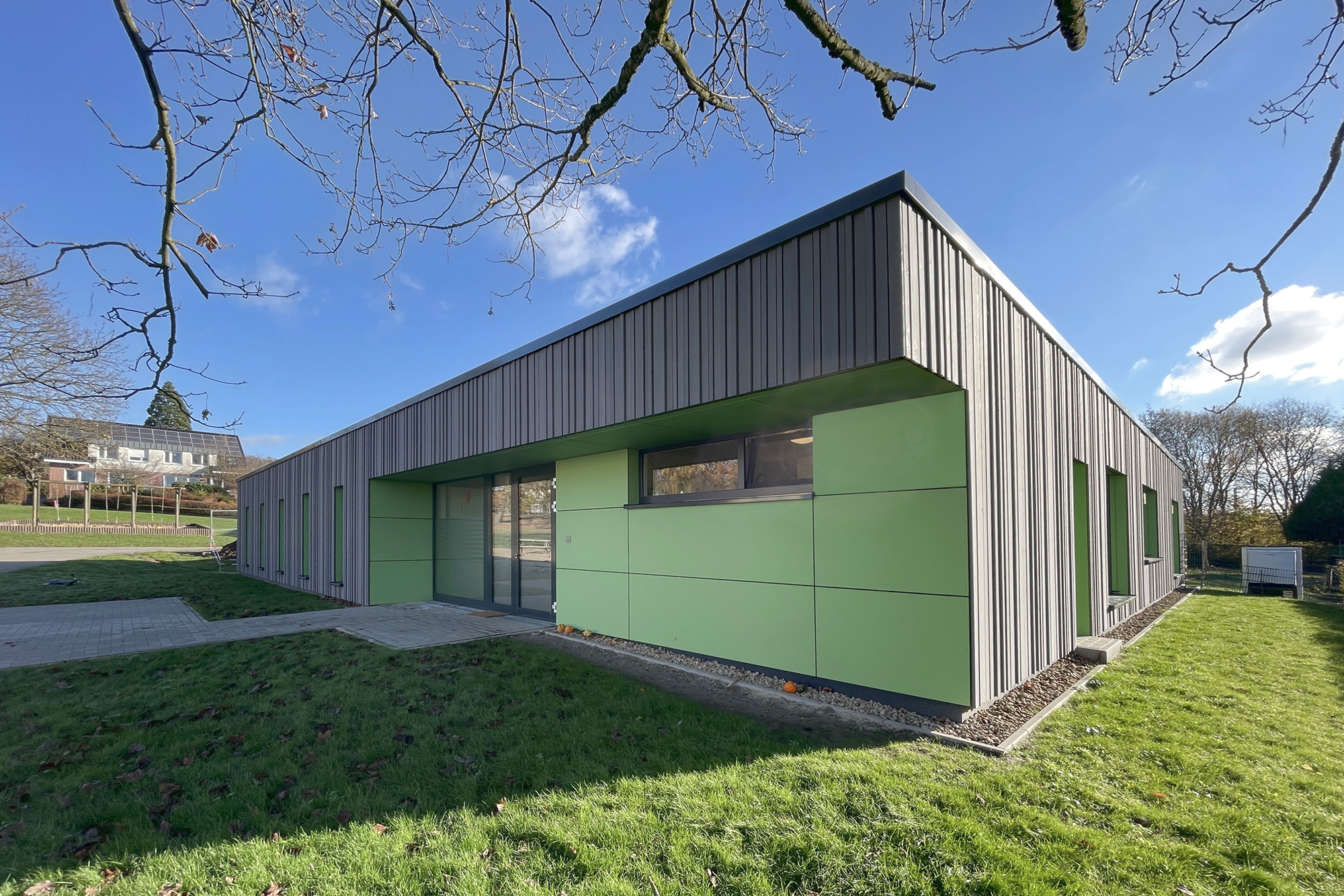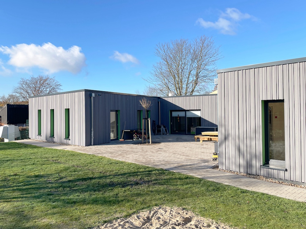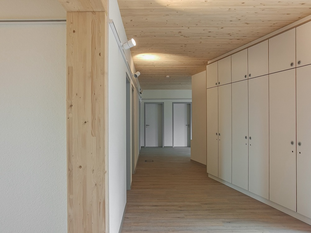 Die freistehende Wohngruppe wurde in vorelementierter Holzbauweise mit Brettschichtholz umgesetzt. Durch entsprechende Bauweise konnte das Gebäude in einem halben Jahr gebaut werden.