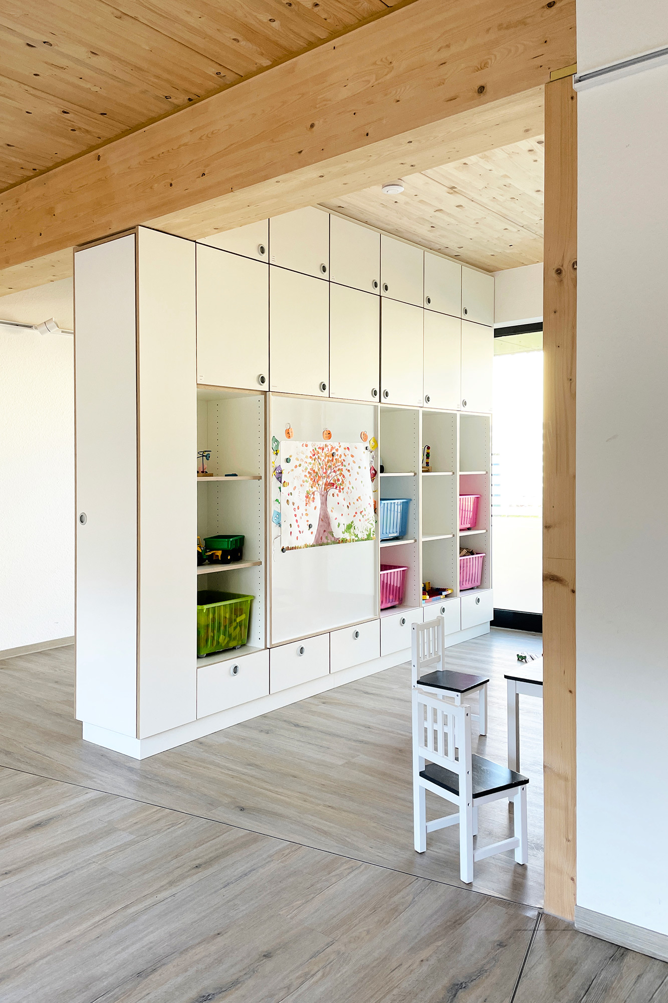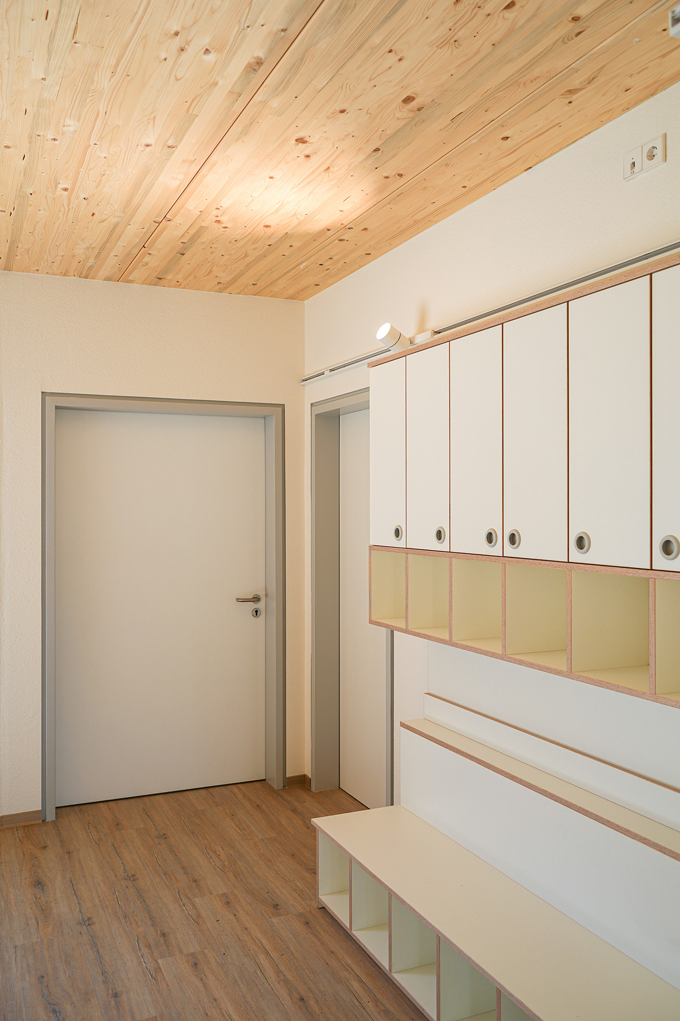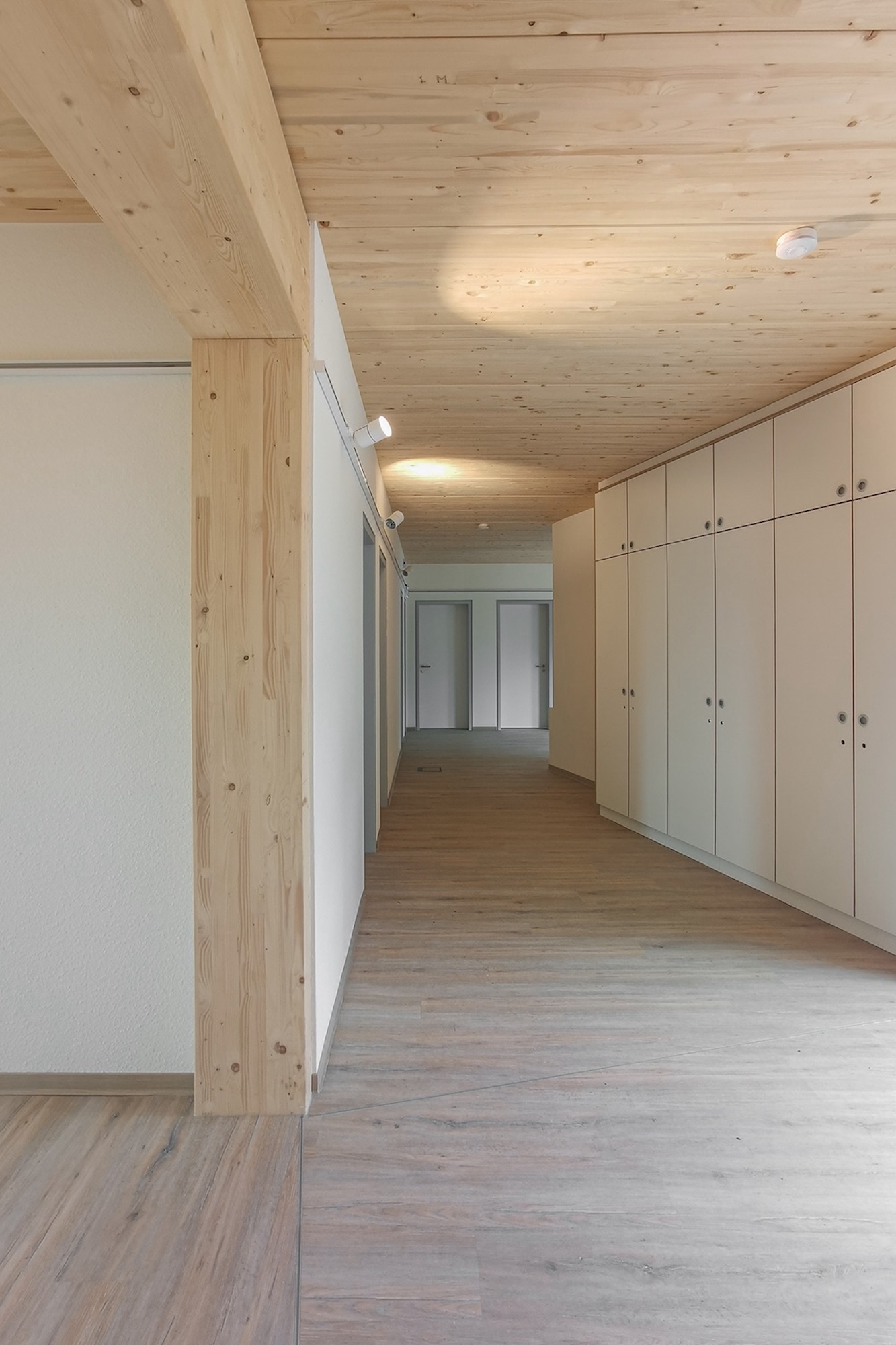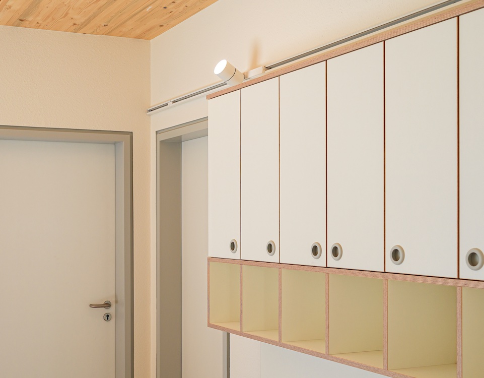 Die freistehende Wohngruppe wurde in vorelementierter Holzbauweise mit Brettschichtholz umgesetzt. Durch entsprechende Bauweise konnte das Gebäude in einem halben Jahr gebaut werden.